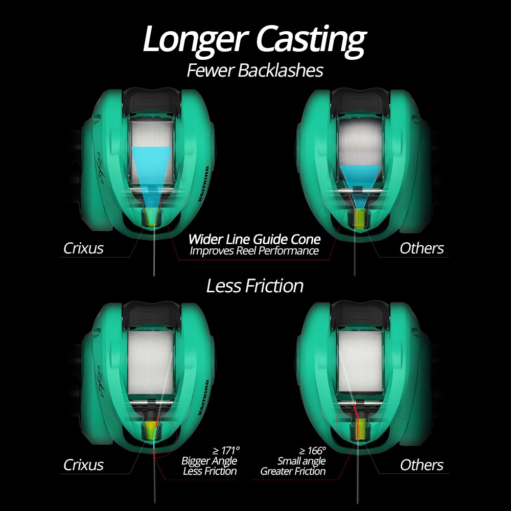 2.Tournament Proven Components – Crixus casting reels feature heavy duty brass main and pinion gears that deliver long life, higher speeds and low noise. The lightweight aluminum handle has comfortable, slip resistant Super Polymer grips, unheard of at this price, for all day fishing comfort!